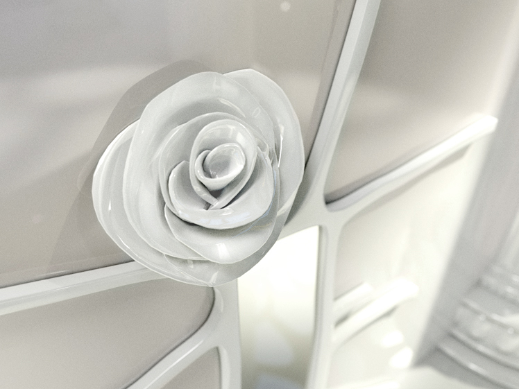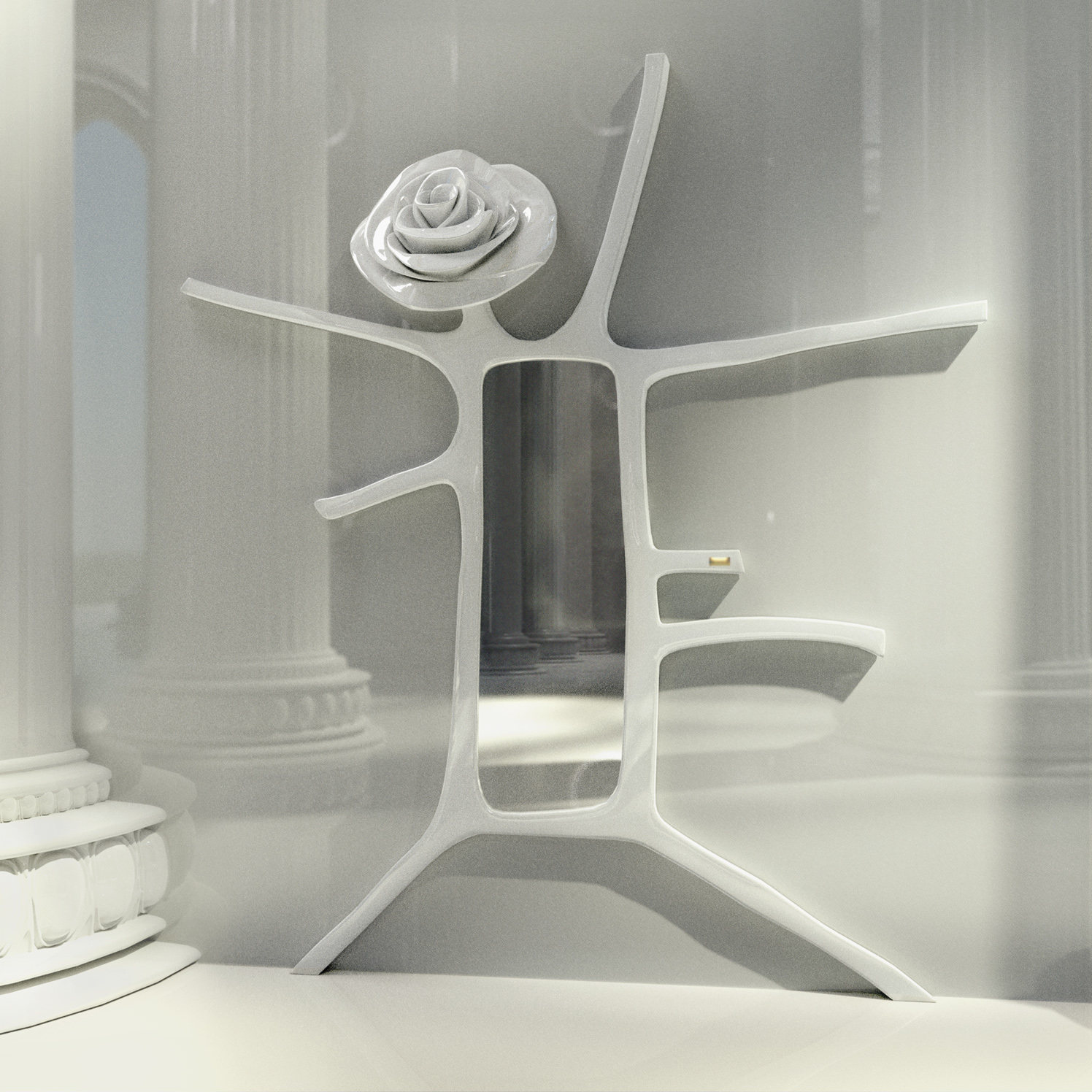 The large rose that rests atop this mirror imbues it with a unique elegance. This creation enhances the bold eccentricity of any interior setting.