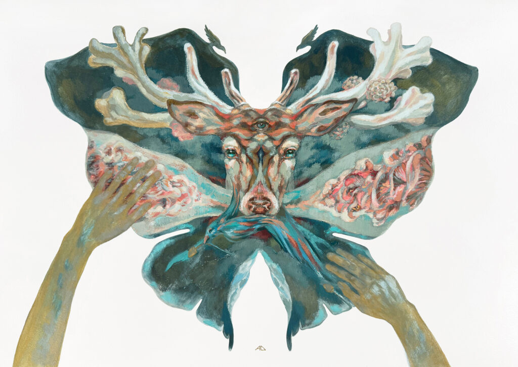 This painting portrays the stag not only as a mystical animal, but as a guide into altered states of perception. Its symbolic presence creates portals into hidden dimensions of reality — layers that remain unseen in daily life, yet reveal themselves through meditation, sound, visionary experience or lucid dreams. Perfect for collectors of mystical, symbolic, and contemporary animal art.