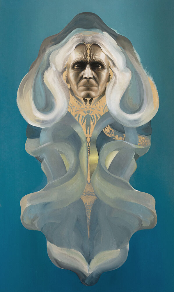This painting is a talisman created to evoke a sense of serenity. It is a meditation on the thin veil that exists between life and death, and the constant interplay that transpires between them. Inspired by my travels in Asia, the painting features an Indian woman’s face. Though she has been touched by pain, her visage emanates wisdom and love.